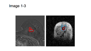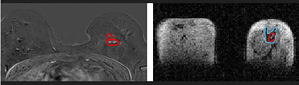 Side by side image of same breast tissue in MRI and FCI. (l) MRI image of breast with cancerous tumours circled in red (r) FCI image of same breast shows same tumour in red with secondary tumour spread in blue. Spread not visible in MRI. The patient had a mixed tumour i.e two different types of tumour and one of them is not visible in MRI.