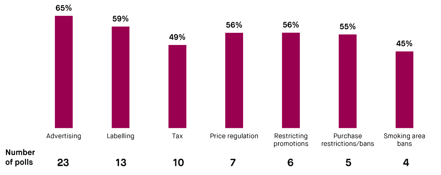 SMF analysis of several public opinions polls published between 2015-2023 on measures to address tobacco, alcohol, gambling and obesity shows that most policies were supported (See note 2), especially those that benefit children – like advertising bans.