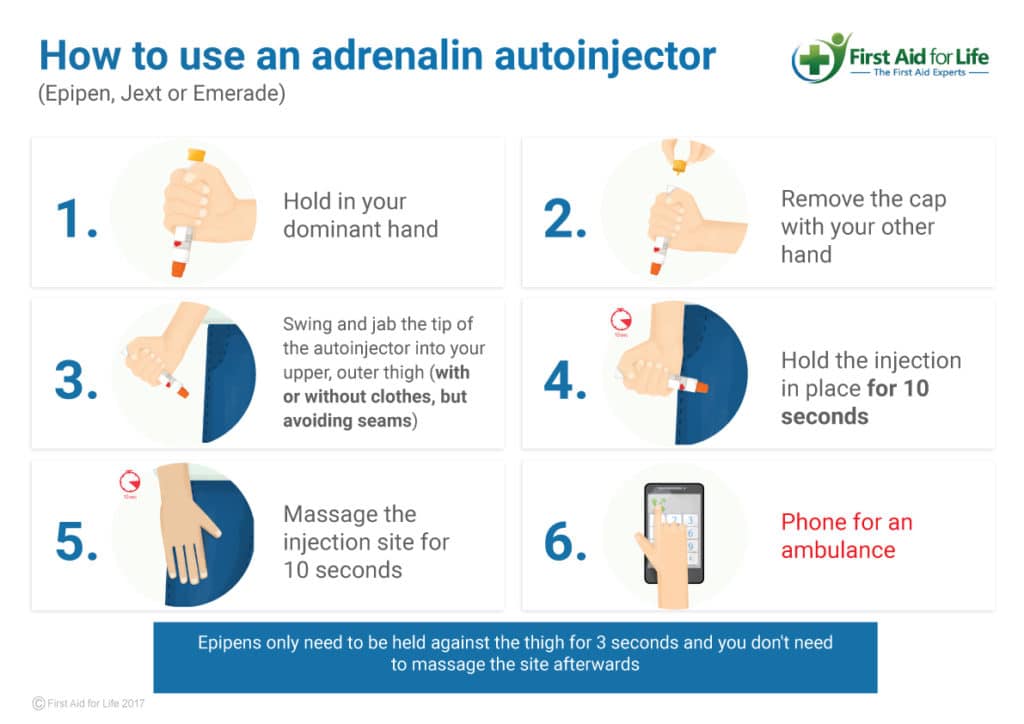 Adrenaline can be safely given by non-healthcare workers as an injection into the muscle using an adrenaline auto-injector (AAI). Current brands available in the UK are EpiPen®, Emerade®, Jext®. School staff should ideally have received appropriate training to be confident administering the medication.