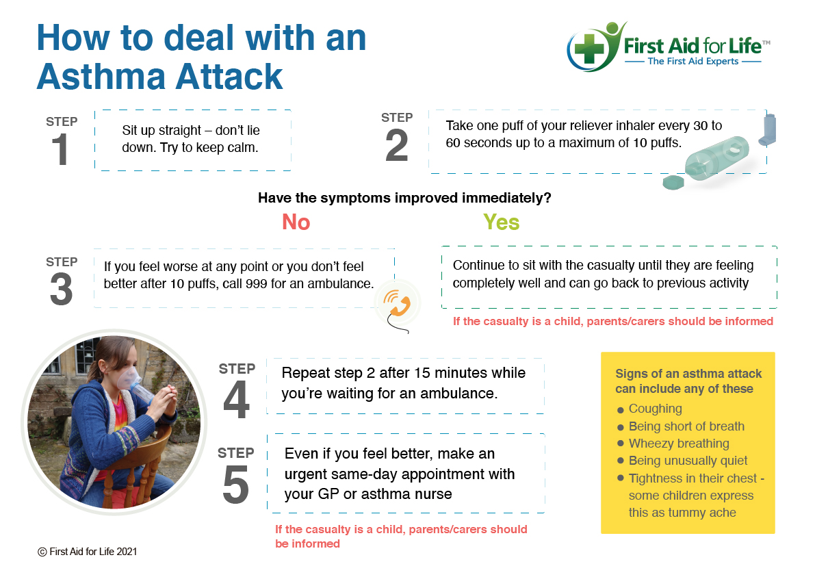 - If you think the asthma attack may be due to an allergic reaction (and the reliever inhaler is not working) and the person has been prescribed an adrenaline auto-injector in case of an acute allergic reaction – it would be advisable to give this injection into the upper, outer part of their thigh according to the instructions. Check with the emergency services and keep them informed and updated as to the casualty’s condition if you are worried in any way.