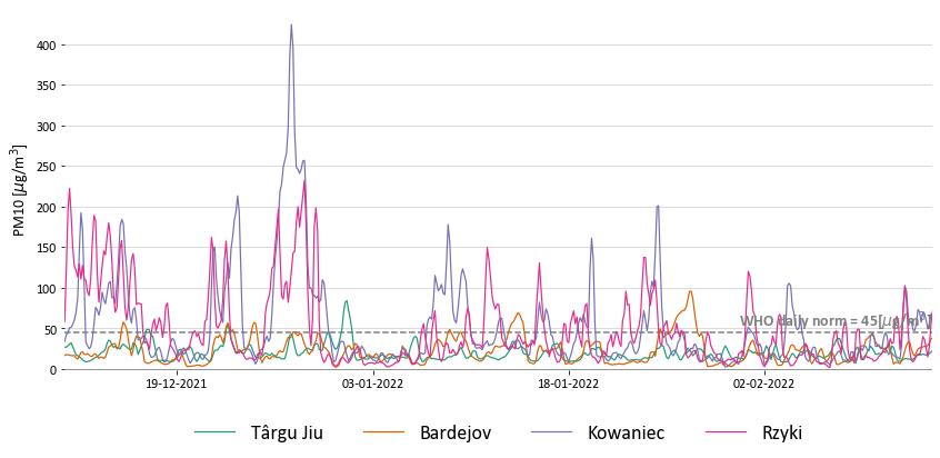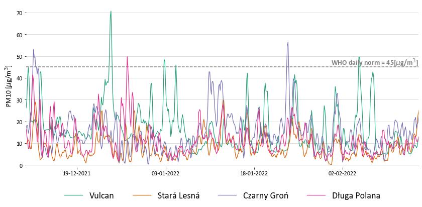 The lowest average PM10 level is recorded in Stará Lesná (Slovakia) reaching 8.6 µg/m3.However, the highest air pollution was recorded in two Polish hotspots for skiing, Kowaniec and Rzyki. Here the averaged level of PM10 concentration is equal to 52.5 µg/m3 and 48.8 µg/m3, respectively – exceeding the norm in both places. Notably, there was one period with very high air pollution in Kowaniec in the final days of 2021. The averaged PM10 equaled 200 µg/m3 in this period. The high concentrations of PM10 observed in resorts in Poland are directly linked to the use of coal combustion for heating in Polish villages.