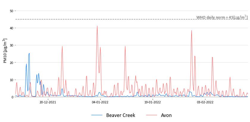 PM10 concentrations in Central European winter resorts: Low altitude placesUSA: very good air quality in winter resorts of ColoradoAirly examined two popular resorts in the US for the purpose of comparison to Europe, namely Beaver Creek and Avon in Colorado, and reported the air quality to be very good in both. There are a few spikes of PM10 but they are not dangerous. The peaks result from the heating period during the day / night.Colorado (USA) Winter resortsMarcin Gnat, spokesperson at Airly, commented: “We are aware that this analysis is not a complete description of pollution in the European winter & ski destinations and no one should make rankings out of it or point to these cities as most polluted as they are a handful the that measure air pollution, which is a big plus. There are hundreds of resorts that we have no intelligence on”.“If we could give some tips to the ski & clean air lovers, we would recommend them not to choose deep and densely urbanized valleys, and instead think of more rural places on higher altitude.”