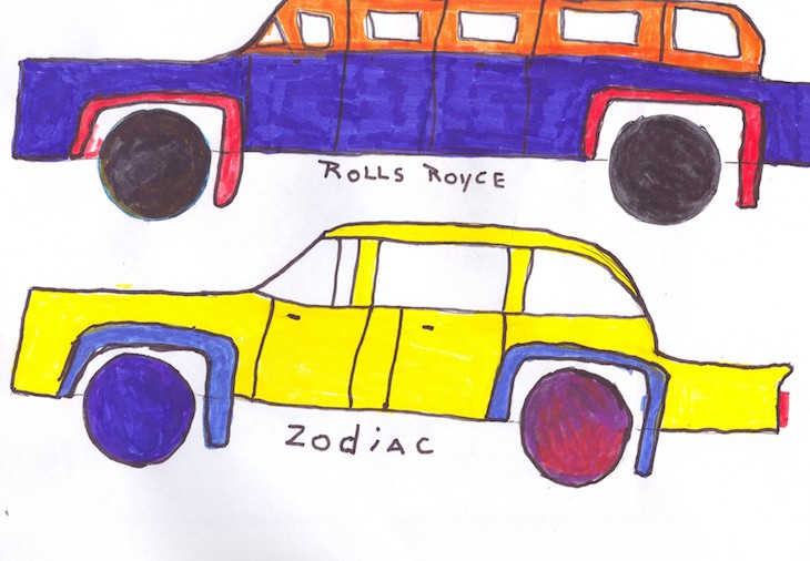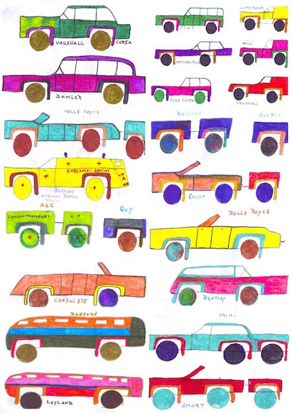 A nurse bounded up to me, announcing ‘Lizzie there’s a new artist in the ward’, and opened an office to reveal a notice board filled with colourful drawings of cars.  ‘You must go and visit Leonard’.  Most of my work involves approaching adults encouraging them to try something new with objects and ideas to spark the imagination.  It was very unusual to discover a patient already finding their creative side by themselves.