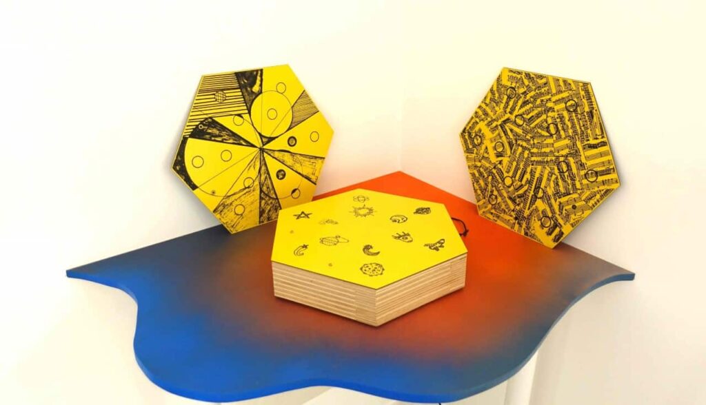 Facilitated by classical music, sunlight and shadow and bespoke technologies, the show reveals some of the processes used by artists working in psychiatric settings where young people living with severe mental health conditions are encouraged to focus away from illness towards spontaneous improvisation. The gallery has become a quiet acoustic space arranged with soft organic shapes, floor cushions, bolsters and benches upholstered in fabrics covered in abstract artworks amongst which are three soundscapes presented as wood sculptures that play when triggered by movement, light and direct touch, and a fourth is a digital work made over Zoom during lockdown.